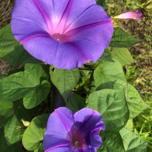 元気すぎる琉球朝顔が今年も出戻りで咲いてます💙💙💙💜💜💜 うちの庭から這い出して1m下の畑へ!もう15年位は毎年顔を出して、見て見て〜🤗と言ってるようですꉂ🤣𐤔