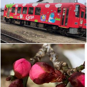 紅梅とカープラッピング列車(ローカル線存続の気運盛り上げに、市民企業が実現させたカープ号)どちらもかわいいでしょう🥰