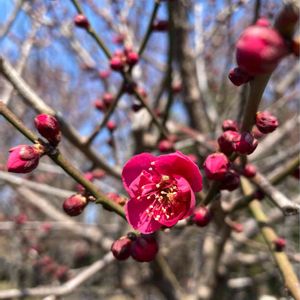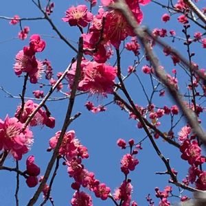 今日は春の陽気で青空の下、紅梅がきれいでした。庭の紅梅も一気に花ひらきました💕💕😊🌸