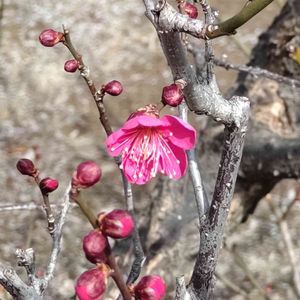 梅 紅梅 田の脇にある小さな流れに沿って植えられている(^^) 早咲きの紅梅となれば花梅だろうか、果樹園の実梅の蕾はまだまだ硬い… かなりの老木とみえて、木肌にはウメノキゴケがびっしりと着き、花数も少なくなっているけれど、枯野を彩ってくれている 百花魁(⌒‐⌒)
