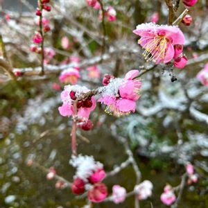 今朝の紅梅🌸 雪を被って寒そうです☺️