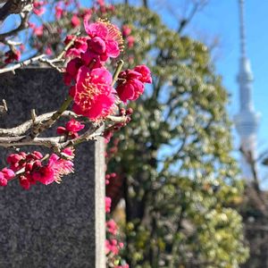お出かけで出会ったお花レポート① 青空と紅梅💕 良い香りも漂ってました! 右側遠くに見えるのは東京スカイツリーです( ˊᵕˋ )b
