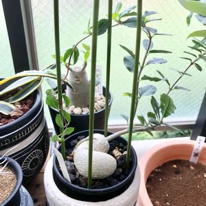芋?岩みたいな塊根が届きました😁 とりあえず植えてみたけどこれでいいのかな🤔 ちゃんと根が生えて葉が出てくるまで、この方たちにしっかり見守ってもらおうと思います😎