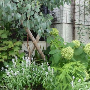 涼やかな雰囲気になるように、花の色は抑えて、緑の濃淡を楽しんでいます。サルビアサリーファンの薄紫がとてもきれいです😍