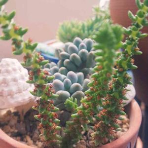 こちらは激しい雨です☔️🌀 風も強く小さい鉢が倒れないか心配です🌱 あっいけない💦 多肉ちゃんの前に🚲️☔️で帰ってくる息子を心配するのが先でした😅 チンアナゴ系のにょろにょろさんの間からベビーフィンガーが覗いてます☺️