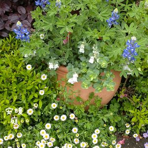 暖かいお正月ですね🎍 ルピナス ブルーボネットです ①お日様に向かって葉の向きが変わる姿がかわいい ②たった1株育ち大きなタネが取れ ました ③9月にタネをまいたら新芽🌱もかわいい 春にブルーのお花が次々と脇芽も咲いてかわいかった 今年はたくさん種まきっ子苗が🌱出来たので鉢植え🪴 小庭花壇 畑花壇に植えました 春にブルーのお花がたくさん見れたら嬉しい
