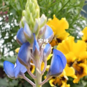 種まきのブルーボネット開花💙 矮性のルピナスです。 残り僅かな種から、1つだけ発芽した貴重な子です😂 続いて小さな蕾も見え始めました🎵 少しピントが合ってないのは、私の目が老眼レフなせい💦 ロゴの位置😅😅😅