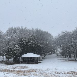 こんにちは♪ 雪が降ったよ❄️その1 降り始めから3時間 ➀➁ゲートボール場 ➂➃➄大きなセンダンの木に鳥たちが集合🐦食事かな?会議かな?