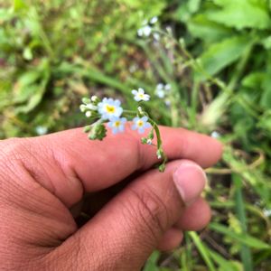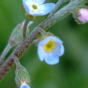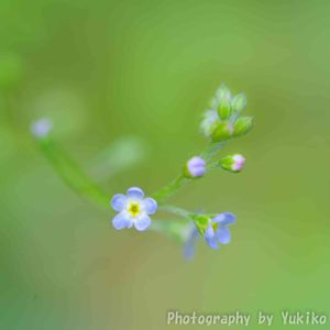【胡瓜草】《ムラサキ科》 とても小さなお花 茎や葉を揉むと胡瓜(キュウリ)に似た匂いがするというのが名の由来である ムラサキ科の特徴で花序の先が曲がる。 これを「サソリ型花序」と呼ぶ。 花径2~3ミリくらいの淡い青紫色をした小さな五弁花を上向きにつける。 花の中心は黄色くなっている。 2021.2.11