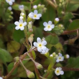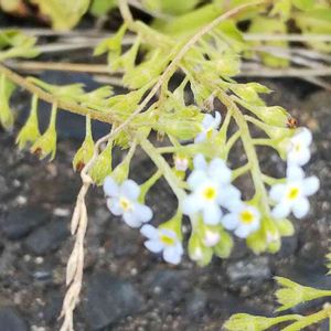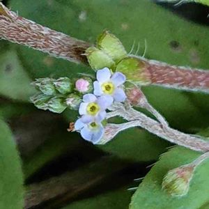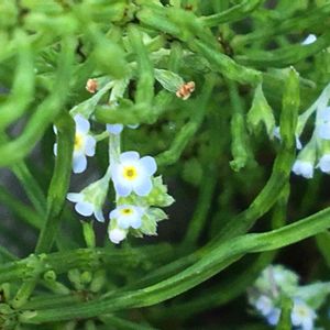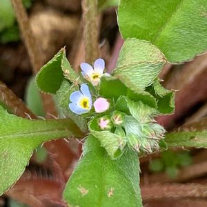 胡瓜草(キュウリグサ) ムラサキ科キュウリグサ属の越年草。道端や田畑の周辺に生える。ロゼットで越冬し、春にロゼットの中心から茎が立ち、葉が互生する。下部の葉は長い柄があり長さ1~3㎝の卵円形、上部の葉は無柄。花期は3~5月だが、秋にも見かける。つぼみのうちは茎の先端が巻き貝のように丸まるサソリ形花序を出し、花が咲き進むにつれて真っ直ぐになる。茎の上部に直径2㎜ほどの淡青紫色の小さな花を次々と咲かせる。花冠(かかん💬花びらがひと続きになっている場合、花弁ではなくこう呼ぶ)の先は5裂して5枚の花弁のように見える。花の中心は黄色い副花冠が目立つ。 葉内花(ハナイバナ)や勿忘草(サスレナグサ)に似ている。本種は茎の先端が丸まり花の中心は黄色い。ハナイバナは茎の先端が丸まらず花の中心は白色。ワスレナグサは全体に大形で、花も直径6~9㎜で本種より大きい。 葉や茎をもむとキュウリに似たにおいがするのが名前の由来。 出典『野に咲く花』『春の野草』