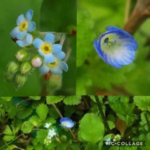 我が家の 倉庫の横に野イチゴ🍓の花と一緒に居る子達です🎵 右上:オオイヌノフグリ(星の瞳) 左上:キュウリグサ 下:両方並んでる所 キュウリグサとフグリのところに太い茎が見えるのがミチタネツケバナの茎です🎵 この時気付いたのですが、そういえば、 この子達とミチタネツケバナはいつも一緒の場所にいます🎵 うちだけなのかな~?(^_^;)