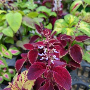 お出かけ先で。 コリウスのカラフルな葉っぱに可愛らしいお花が咲いていました☘️💚🩷💟🌸💮🌸💜💗💚☘️