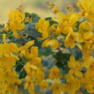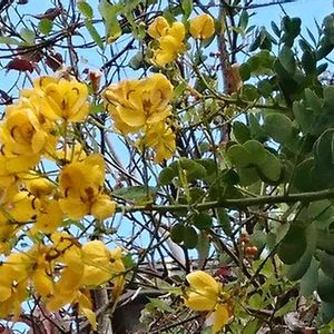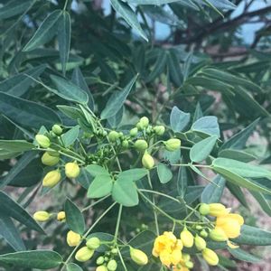 良い日になりますように。 特養ホーム🏠のお庭にて コバノセンナ 咲き頃 10月〜12月 原産地 南アメリカ 秋から初冬にかけて 黄色の5弁の花を付けます。ネムノキの様に夕方になると葉を閉じます。