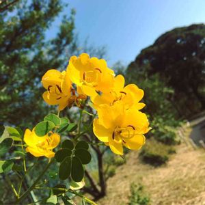 好天☀️公園🌿 黄色の花は光の加減でキラキラと✨ 〝コバノセンナ〟と〝モクセンナ〟の識別は対生している葉っぱの数で…。両方を見つけて「ホントだ〜」やっと わかるようになりました🧐