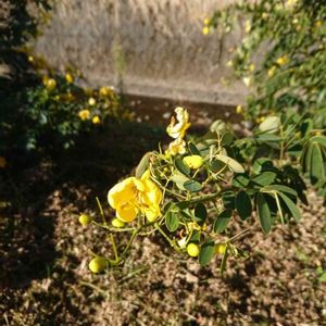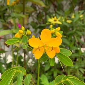 何だかわからないお花が咲きました💛 去年の10月に道端に咲いていた豆科らしき黄色いお花。種ができていたので持ち帰って試しにまいてみたもの✨ 何の花だかご存知の方おられましたら教えてください🙇♀️ 発芽率100%でわずか5ヶ月で開花🌸 もしかしたら繁殖力半端ないやばいやつかも😱 コバノセンナと教えていただきました。