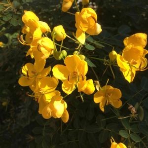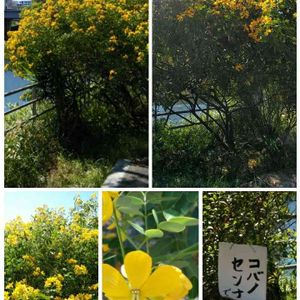 「遊歩道脇で咲く花」 撮影📱2021.10.10 熊本市草葉町の白川 右岸遊歩道で撮影📱 コバノセンナ🌼 南米原産のマメ科センナ属 耐寒性が弱く 関東以西の温暖地以 外は庭植え困難な花🌼 枝先に黄色の花🌼を 咲かせ マメの様な実をつける が実がなるんは稀やて