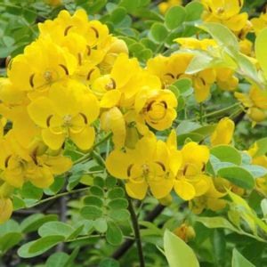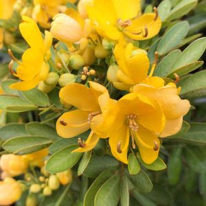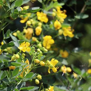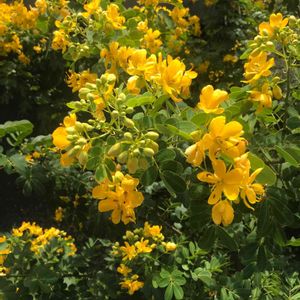コバノセンナ(小葉のセンナ)は同じセンナ属のハナセンナ(アンデスの乙女)とよく似ていますが コバノセンナは葉っぱが小さく丸っこいことと雄蕊がクルっとカールしていることで区別できます。 鮮やかな黄色い花は花径2cm位の5弁花で 一面に咲く姿は一際目を惹く美しさです。 英名はスクランブルエッグと言う とてもユニークな名前です。 ブラジル・アルゼンチン原産。 マメ科センナ属の常緑低木。