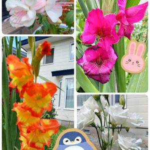 グラジオラス7つ目8つ目咲きました🌼 1つは最初のと同じオレンジ×黄色💛 もう1つは初めての濃ピンク💗 フクシアはあまり日が当たらないせいか買った頃よりピンクが薄めの花💠これはこれで可愛い😊 トルコキキョウも次々咲いてます🤍 スタンプでも隠しきれない雑草😂北海道で35度は地獄🥵 ずっと草むしりしてなくてごめーんね💦(まあ、するのは夫だけど😁)