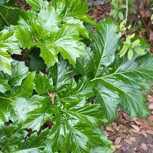 💚アカンサスモリス(キツネノマゴ科)別名 葉アザミ 🌱常緑のツヤツヤとした大きな葉が目を引きます 初夏には大きく伸びた茎に緑紫の花を付け、壮観(アザミとは関係ナシ) ー昨日の慶沢園(元住友家本邸庭園)でー