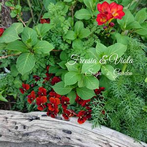 【フリージア&ビオラ】 珍しく…ちょっとした赤ゾーン❣️ 『フリージア』は昔、コープのカタログで球根ミックスを買った中に入っていたもの😊 15年以上経っていますが毎年咲いてくれます。 とてもよい香りがします😍💕 今年は薔薇『コロラマ』のお膝元に移動してみました。 そして、渋い赤い『ビオラ』も~😂💕 『コロラマ』も赤い薔薇です😆(裏側が黄色) 同時に咲くのは無理かな~😅 真ん中の大きな葉っぱは紫陽花💠 萌えてきましたね~🎶 挿し木の苗で、名前忘れました💦 咲いたら思い出すかも⁉️ 花芽あるかな~?? 周りにも種蒔きっこがわさわさしています。 植えすぎたか心配💦 ほんとにどうなることやら…😵💦 今日は高校、中学の始業式で時間帯がバラバラなので、バタバタしていました。 DIYの続きは出来ず… あっという間に1日が終わりました~😵💦 雑草も元気になる時期ですね😭 『タピアン』の隙間に雑草が!! 細かくて抜き抜き大変💦 グランドカバーしたら雑草生えにくいんじゃないの~!😢
