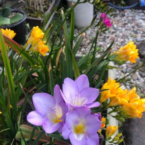 🏠のお花達 まだあるよ~~😁😁 フリージア 🥰 これもミニなのよ。 高さが10㎝くらいしかないの。その割に花が大きい。大きなお口を開けて・・・容姿がひょうきんです。🤭 いい香りです・・😌 💦💦💦 upし過ぎました。🙏
