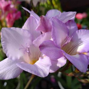 フリージア(アヤメ科フリージア属) 品種 ブルースカイ 南アフリカ原産 別名 香雪蘭 草丈は50~70cm程度まで伸び 細長く線状の葉を伸ばします お花は小さなラッパのような形をしており花径は2~4cmですが 現在は5cmになるものもあります 甘いかおりと鮮やかな花色が人気のフリージアですが 白色や黄色は強く甘い香りがします あかいろやピンク色、青や紫色のお花はそれほど強い香りではありませんが とてもフルーティなさわやかなかおりがします 花言葉 あどけなさ 純潔 親愛の情 ブルースカイは薄紫色の品種です