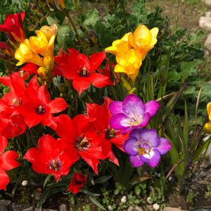 フリージアとミニチューリップ 同じ場所に植え込んでおいたのですが、一緒になってよかったです。 ミニチューリップさんがずっと待ってました。もうすぐ花びらが落ちそうです。でも間に合いました。いい写真が撮れました。😊