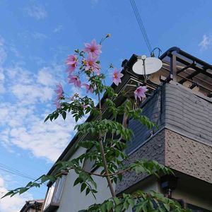 こんなにご近所にあったんだ😲 二階ベランダまである 背丈~皇帝ダリア 見下ろされています👀 私も背筋が伸びました🙂