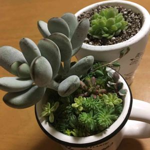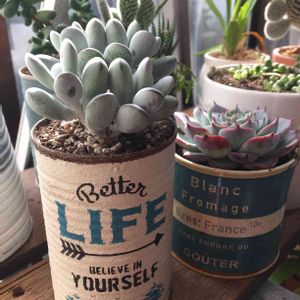 2年前の写真なのですが、 多肉にハマり始めた頃 見よう見まねで作ったリメ缶に植えたての図です😊 苗が可愛いので、初心者ながらも良い感じになりました 苗はロウルサンコさんとヤフオクにて