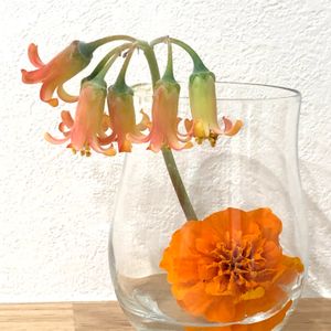 久しぶりに帰省する娘から「マリーゴールドの花の苗を貰ったから持って帰るね」と💕 でも、途中で花がポキッと折れちゃった💧 花はグラスに浮かべて🌼 福だるまの花をカットして一緒にグラスに挿しました。 シンプルだけど、ほっこり暖かい気持ちになります☺️