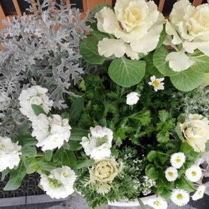 *ハンギングバスケット* 葉牡丹のハンギングバスケットを作りました。 葉牡丹、シロタエギク、セダムで作りましたが、少し寂しかったので、ビオラ❤さんを、たしました。❤💚💜