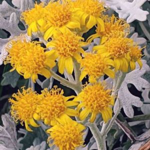 うちの裏庭の背高ノッポのシロタエギクが花咲きました❣️咲いてる?まだ咲き始め?