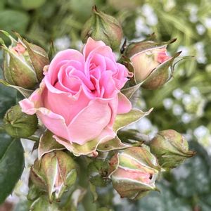 薔薇 ジェントルフロウ ぐるぐる渦巻き品種さんの蕾が緩み始めました🎵 蕾が全部開花したらすごくかわいいのですが、まだもう少し先かな💦