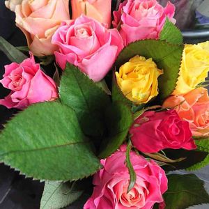 昨日、バラの花束が10本で680円 安かったので買って来ました~🌹 追記 似ているけどハッキリしない 1番下のバラはアーリエスかも。 オレンジ系はカルピデューム