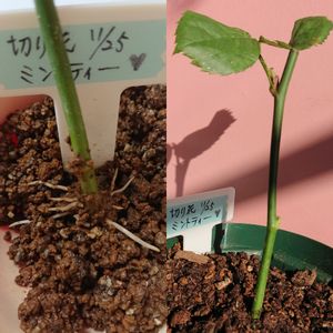 バラの挿し木🌹 挿し木して27日目です。 まだポット下から根は確認出来てない状態で新芽が動き出したのですが、芽が動き出すのは余り良くない状態でしょうか?分かる方アドバイスよろしくお願いします(ㅅ´ ˘ `)