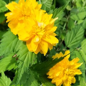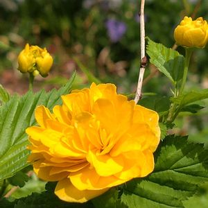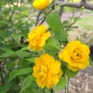 黄色いお花シリーズ ヤエヤマブキ。 山道脇で鮮やかに咲いてました。