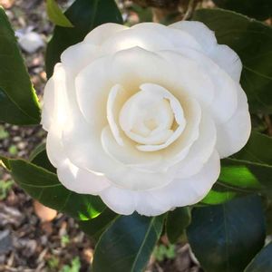 《椿・さつま》 白色で八重咲きの《さつま》と言う名前の椿です😊🌿。 真っ白で、やや大きめの花なので、とても豪華です🤗❣️。 例年、たくさんの蕾がついてくれるんです😃🌟。