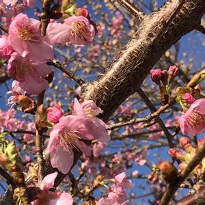 🌸寒緋桜🌸 公園で2番目に咲く桜 沖縄で桜と言えばこちらをさすそうです。 亜熱帯性の桜だそうですが比較的耐寒性があり、関東でも育つようです。 東北にはこの色の濃い桜は見られないのかな🤔