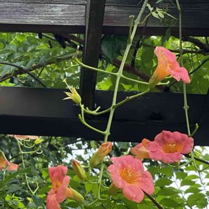 🧡ノウゼンカズラ🧡 パーゴラに咲いてます。 反対側には藤の花💜 最近やっとどちらもパーゴラの上に拡がってきました。 夏に日陰を提供してくれるのはもう少し先かな😅