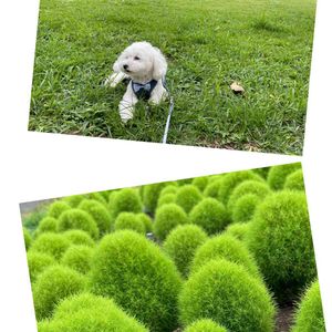 💚コキア💚 大小可愛いコキア達💭🟢💭🟢 昨日のお散歩、涼しいと言ってもやっぱりわんこには暑いんですね💦 芝生の上で歩かなくなりました😅 ヒンヤリ草の上は気持ちがいいのですね❣️