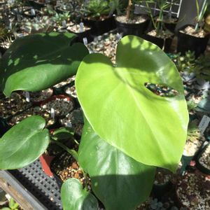 モンステラの屋外栽培。育ちはかなり良いんですが、あの特有の切り込み入りの葉が全く出てこない…。 次の葉に期待です!