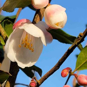 (*ˊᵕˋ*ค⁾⁾✲゚︎*お疲れさまです 🌸 エ リナ🌸 蕾の時は ピンクで 咲くと 白く 可愛い 椿さん 🌼*・ 毎年 蕾は ついても 咲かないで 落下 (๑•́o•̀๑) ↯↯ 今年も だいぶ 落ちましたが ⚘˖* 咲いてくれました ヾ(o´∀`o)ノ