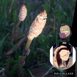 拡大してみたら破れたところから、お化け提灯を想像しました。 つくしって元々あやしい感じと思いませんか🤣 なんか妖怪っぽいというか🤣 (右下は北斎作) 2020年3月下旬 片倉城跡公園