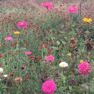 お花畑。夏から引き続きで咲いてるんじゃないかと思いますが、少しまばらなヒャクニチソウのせいもあって?秋の寂寥感が漂います。 2019年10月 日の出町 勝峰山の麓の里