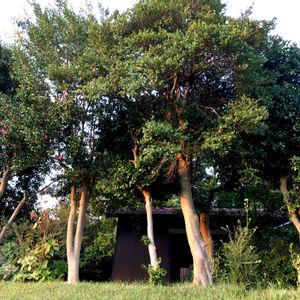 薬用植物園を出て、付近の里を散策。 玄関へのアプローチは、ツバキ、ツゲ、サザンカの植栽。なんともステキ🌟 夕日が差していました😊🍀 八王子市堀之内