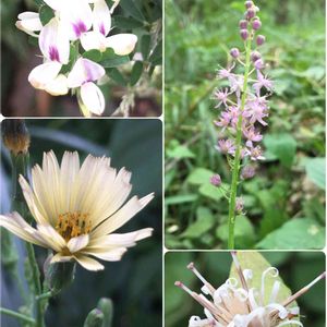 3〜4百メートルぐらいのかなりの低山でしたが、ここはちょっとだけ高山のような趣き🌟 しばし尾根歩きが楽しめました😊向こうは戸倉三山の臼杵山。でも登らず下りました。 (時計回り) キハギ。咲き始めでした。 ナガバノコウヤボウキ。この山にはたくさんありました。これはつぼみです。 ごく小さな紫の花、なんでしょうか?ヒメヤブランと教えていただきました! 2019.9.1 あきる野市 盆堀山