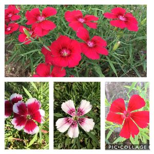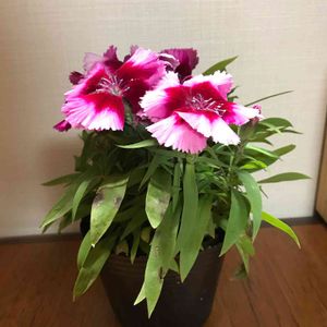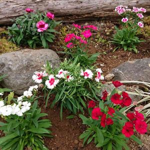 大輪のナデシコ? 上の1色だったのに、下の3色の株に分かれました😳不思議💕種からだと親と異なる花が咲くことも多いらしいですね🌸