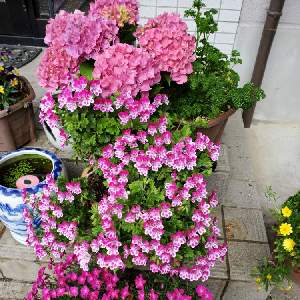 咲き始めて、結局こうなりました‼️ チェリーセージの苺ミルク🍓🥛 ジャーマンアイリスが申し訳なさそうに咲いてます 壁のハンギングは、美味しそうと眺めている様です❣️💕