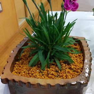 小ぶりの色がわりのナデシコが咲いている鉢は唐津焼です。 リフレ(老人福祉センター)の陶芸グループの方の作品。 紐状の粘土をすき間なく四角形に積み上げて作られた一品でしょうか。