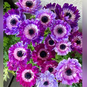 1️⃣ アネモネの花束みたい😆💙💜 アネモネ『アンアリス』(2年目の3年株)です。こんなに咲くの⁈と驚いています😳 2️⃣ 朝や曇りの閉じている時。 ← 大きいお花は1番花。赤紫だと文句を言っていた子。 → 今朝。ニョキニョキと凄いですね。まだワサワサの葉っぱの中に蕾が隠れています💜 これだけ咲いてくれるんだから、色が違うとか文句を言うのは可哀想かな😅 でも…戻ってくれたら嬉しいナ🥹